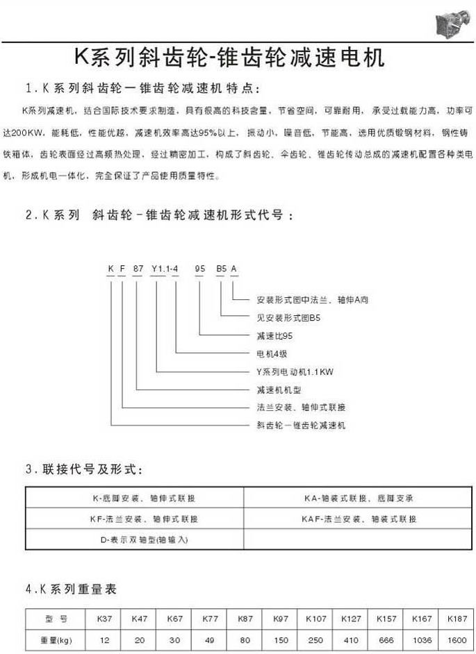 K系列斜齒輪-錐齒輪減速機(jī)特點(diǎn)型號(hào)表示法聯(lián)結(jié)代號(hào)及形式重量表