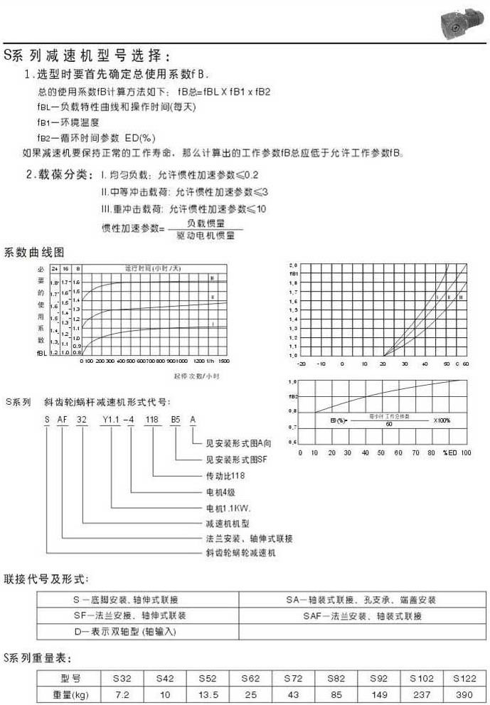S系列減速機(jī)型號(hào)表示系數(shù)曲線圖聯(lián)結(jié)代號(hào)及形式重量表